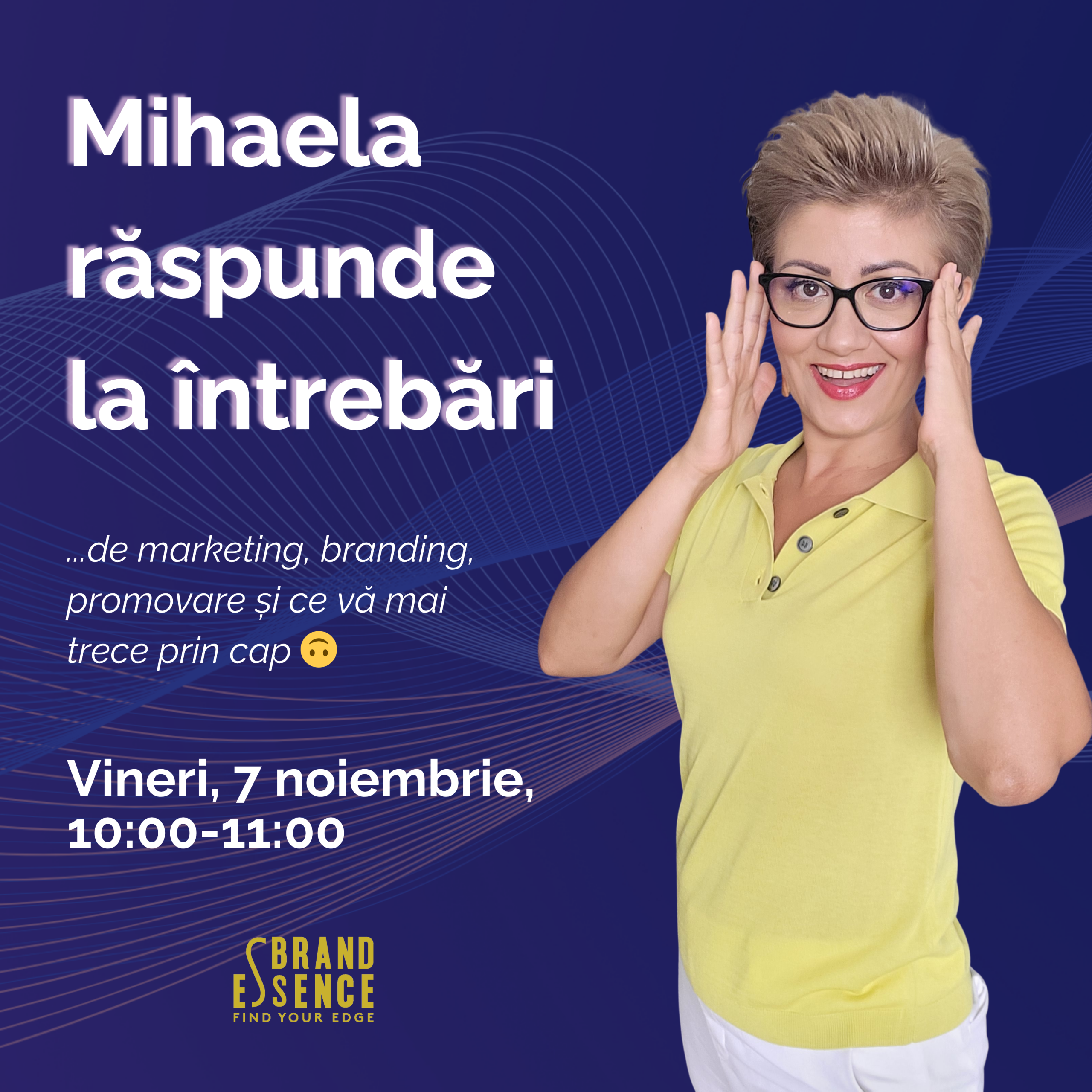 La fiecare 2 săptămâni, vineri de la 10:00, Mihaela Mureșan răspunde în direct participanților la orice întrebări de marketing, branding, marketing digital, social media, comunicare, creație, organizarea activității de marketing, procese specifice, rebranding, branding personal, employer branding, poziționare, politici comerciale, lucru cu agențiile sau echipa, dezvoltare oameni, evaluarea performanței, modele de business și orice alt subiect din aceste teme.